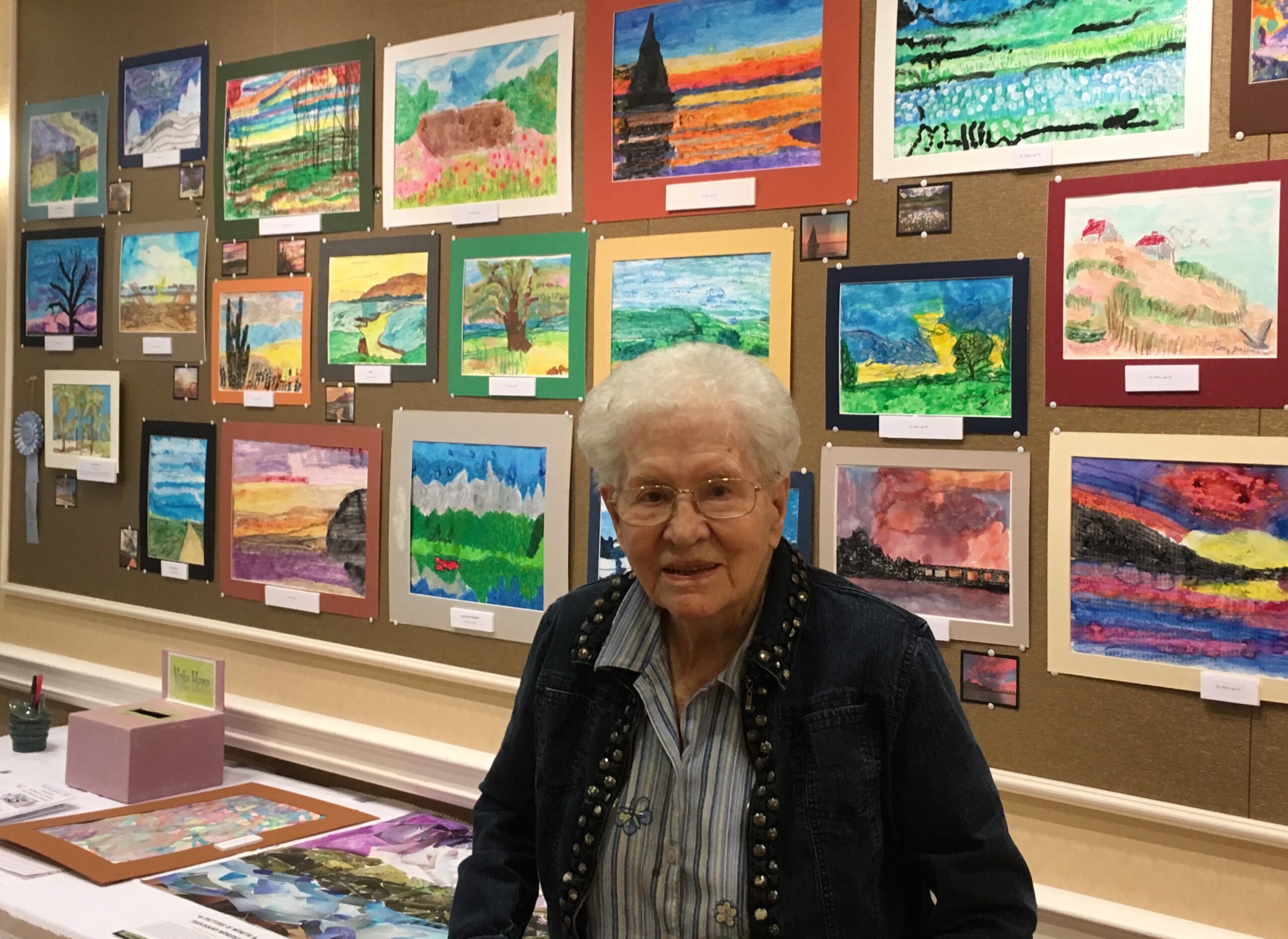 Another notable artist was our very active resident Betty, who celebrated her 100th birthday the week after the art fair. To celebrate, we kept Betty’s art on display for an extra week. Betty won her first artist award last year at the grand old age of 99, so we had her prize winning image imprinted on her birthday cake. She continues to create artwork to add to her portfolio, and has shared that her goal for this year is to win another artistic prize!